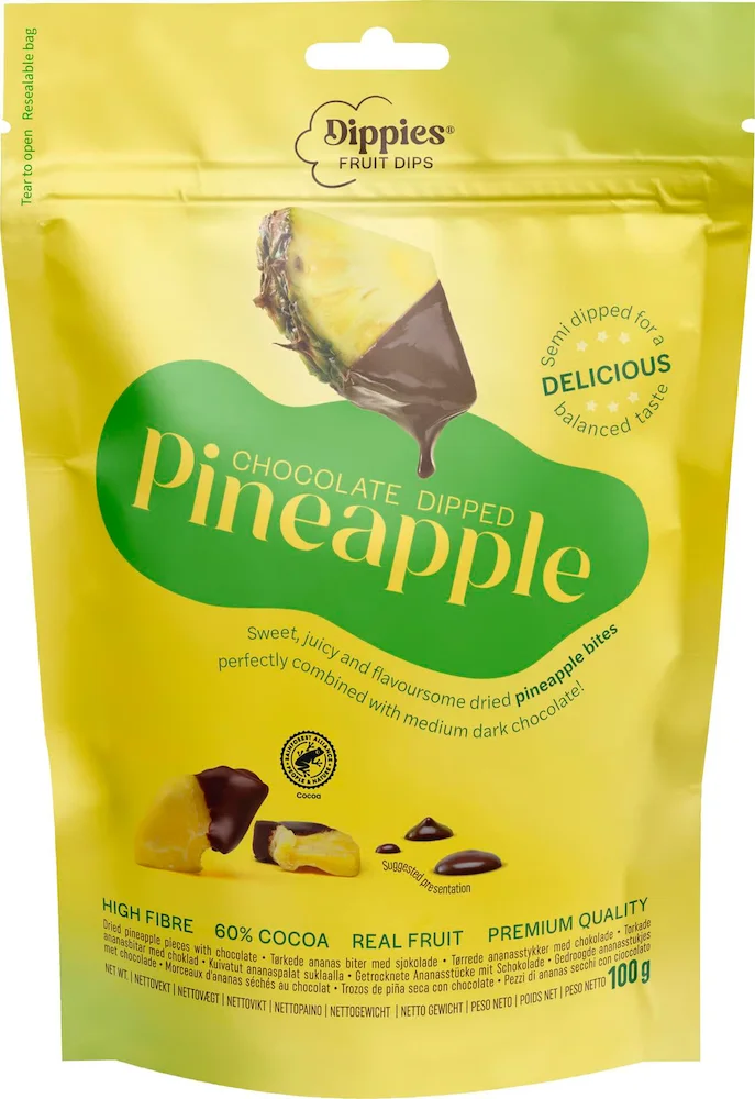 Dippies Fruit Dips Ananas er tørket ananas dyppet i sjokolade – tropisk fruktsødme møter kremet sjokolade i et snacks som er enkelt men vanskelig å slutte med. Seigt, søtt og litt eksotisk i hver bit. 🍍🍫