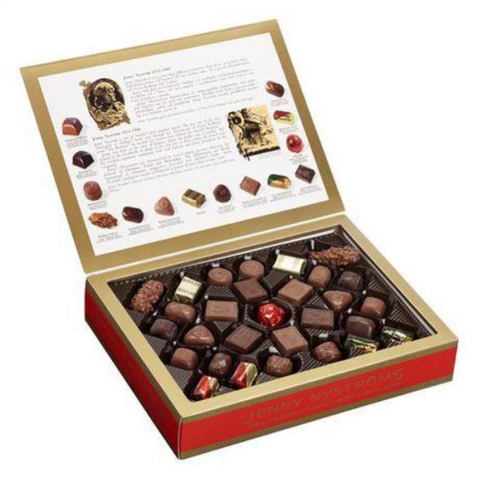 Sjokoladeeske med klassiske Jenny Nyström-motiver fylt med eksklusive sjokoladepraliner.