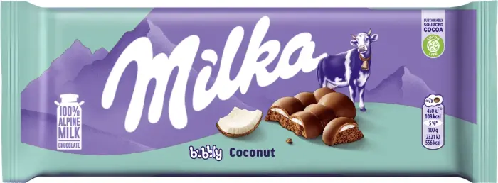 Milka Bubbly Coconut er et ytre skall av kremet alpemelkesjokolade med et luftig, boblende indre fylt med kokosfyll. Lett, skummende og tropisk – en kombinasjon som tar den klassiske Bubbly-opplevelsen rett ut på en strand. 🥥🍫