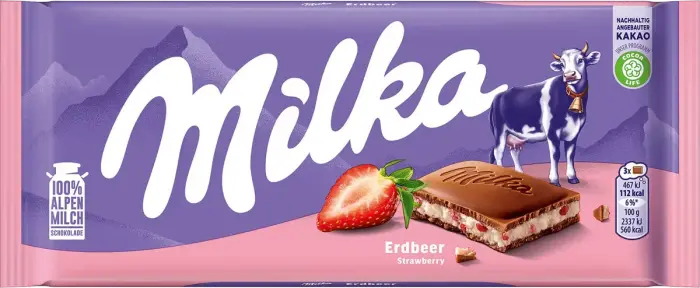 Milka Strawberry er kremet alpemelkesjokolade fylt med et mykt yoghurtfyll med jordbær – syrlig møter søtt i en kombinasjon som er friskere enn din vanlige sjokolade. Mykt, fruktig og vanskelig å nøye seg med én bit. 🍓🍫
