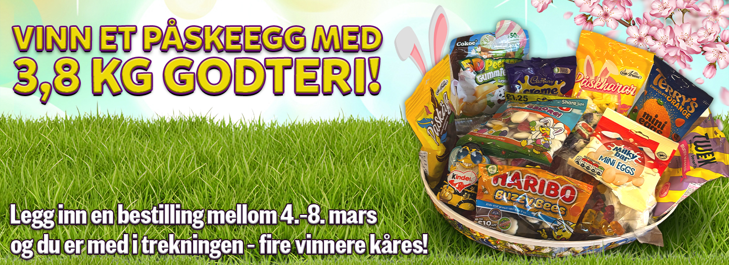 Mellom 4.–8. mars har du sjansen til å vinne et skikkelig drømmepåskeegg fylt med hele 3,8 kg godteri!Alle som legger inn en bestilling i kampanjeperioden er automatisk med i trekningen. Vi trekker fire heldige vinnere blant alle bestillinger – så benytt anledningen til å fylle opp lageret og samtidig få sjansen til å vinne noe ekstra søtt til påske!