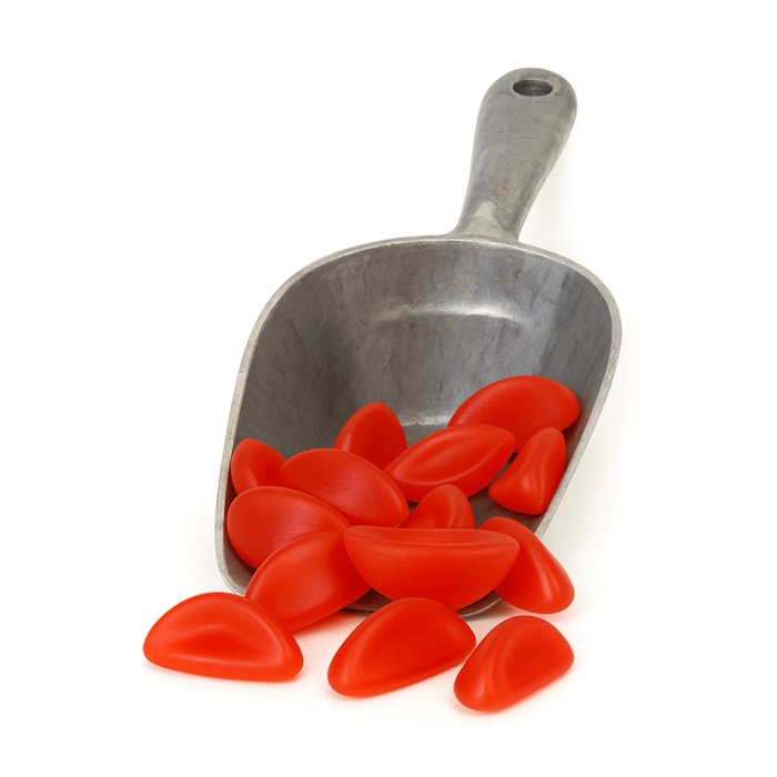 socker, glukossirap, gelatin, surhetsreglerande medel (E330), vegetabilisk olja (kokos, raps), ytbehandlingsmedel (E901), aromer, färgämne (E120). Näringsinformation: Per 100g. Energi: 1484kJ / 355kcal / Fett: <0.5g / Varav mättat fett: <0.5g / Kolhydrater: 80g / Varav sockerarter: 61g / Protein: 7g / Salt: 0.02g.