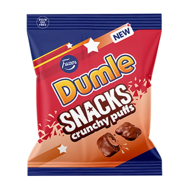 Dumle Snacks Crunchy Puffs er når den klassiske Dumle-karamellen blir snacks! Sprø hvetepuffer med Dumle-smakad fylling dekket i melkesjokolade - perfekt balanse mellom knask, karamell og sjokolade. Hver puff er en liten Dumle-eksplosjon i munnen bare med ekstra crunch. Perfekt for deg som elsker Dumle men vil ha noe sprøere å tygge på!
