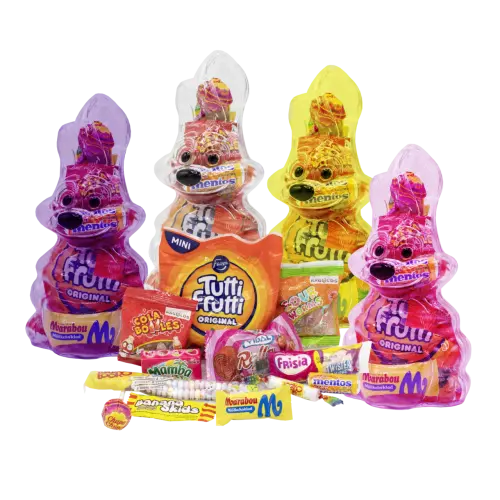 Påskekaninen fylt med godisoverrraskelser! Denne fargerike plastkaninen er full av populære godterimerkevarer - Marabou melkesjokolade, Mentos, Tutti Frutti, Mamba, Sour Worms, Cola Bottles og mye mer. Perfekt påskegave for barn og voksne som elsker godteri. Fargen velges tilfeldig - lilla, transparent, gul eller rosa. Hva mer kan man ønske seg i påsken? 🐰🍬
