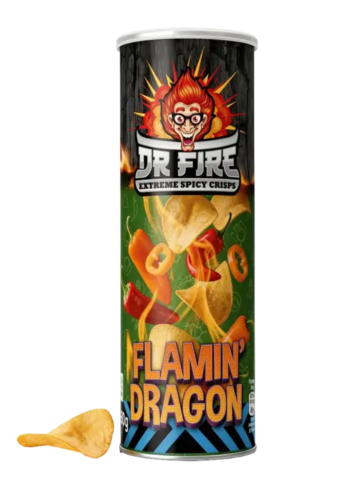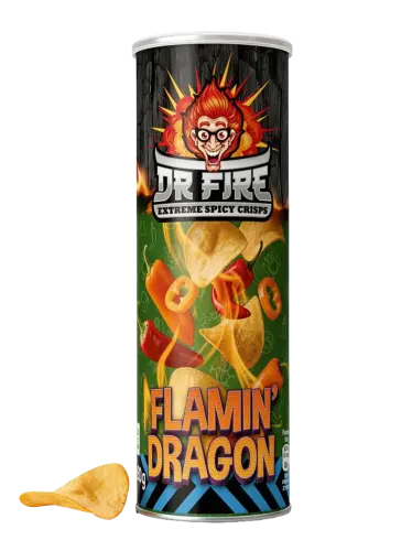 Drakens åndedrett i chipsform! Dr Fire Extreme Spicy Crisps Flamin' Dragon er chips for den modige - ekstremt hete og krydrete med drakens egen hetta. Sprø chips som brenner fra første bit og ikke slipper taket. Perfekt for deg som elsker het-utfordringer eller vil imponere vennene med din toleranse. Advarsel: dette er ingen lek! 🐉🔥