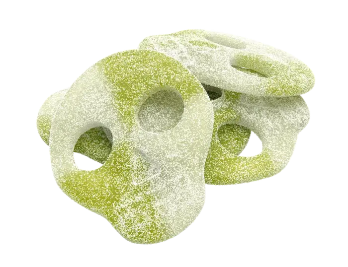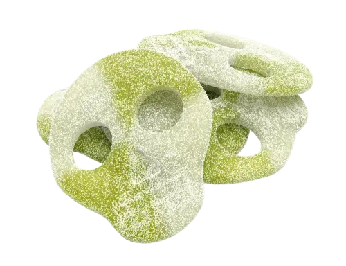 Dødninghoder med eplебett! Candy People Sour Apple Skulls er de sure dødninghodene med eplesmak og vingummiliknende konsistens. Søte, sure og litt skumle - perfekt balanse mellom fruktig og surt. Perfekt for deg som elsker både surt godteri og litt mørk humor, eller bare vil ha godt godteri med holdning! 💀🍏