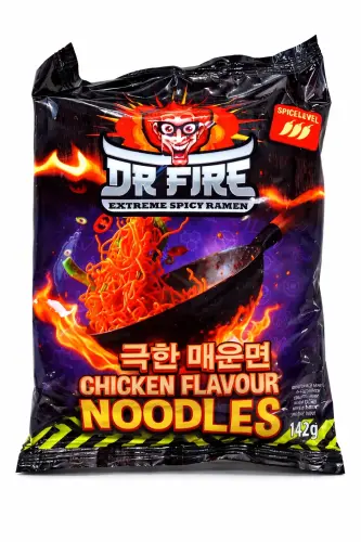 Ekstremt het kyllingramen! Dr Fire Extreme Spicy Ramen Chicken Flavour Noodles er nudlene for den modige - ekstremt hete og krydrete med kyllingsmak. Spice level 3 - ikke for følsomme munner! Perfekt for deg som elsker het mat og vil teste grensene. Advarsel: dette er ingen lek! 🔥🍜