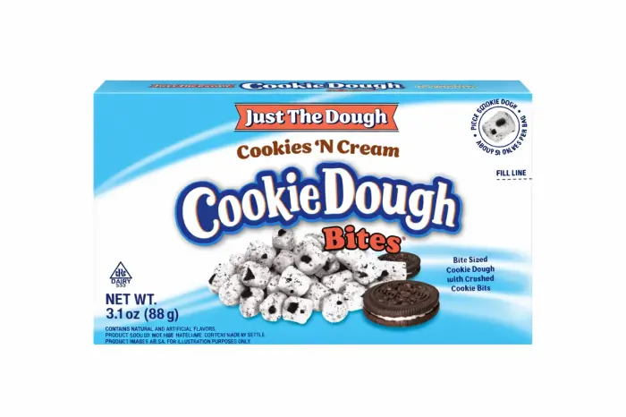 Cookie dough på kino-vis! Just The Dough Cookie Dough Bites Cookies 'N Cream er kakedeigbiter med cookies and cream-smak - som Oreo bare i frossen cookie dough-format. Små frosne biter av kakedeig med knuste kakebiter inni. Perfekt for deg som elsker cookie dough og Oreo-smaker! 🍪🎬